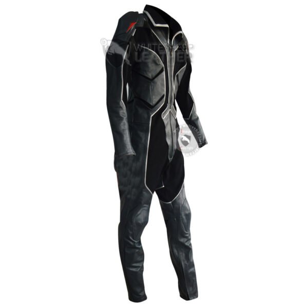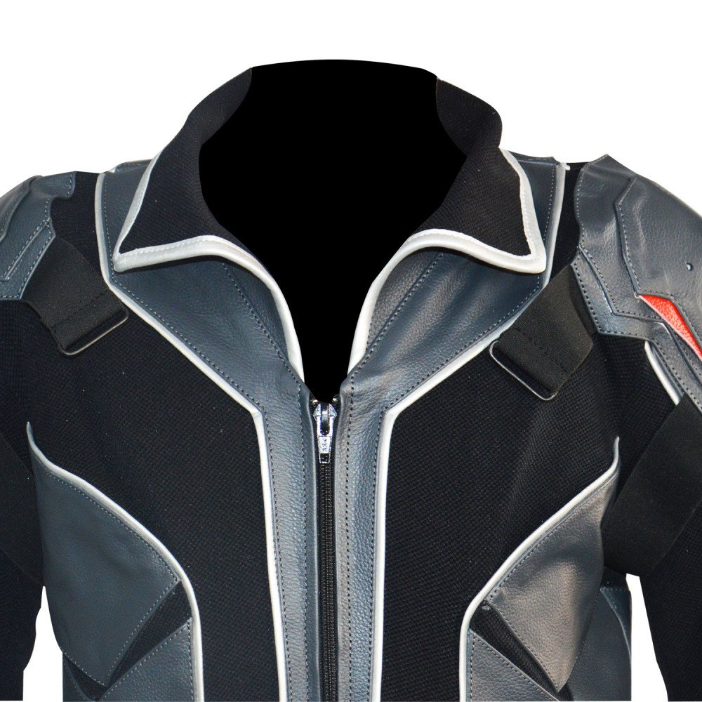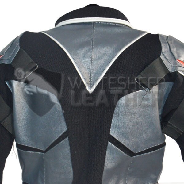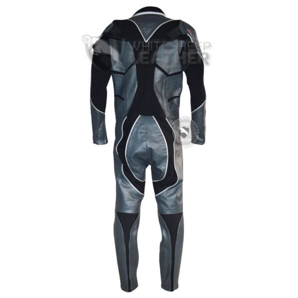 it is one piece suit made from Gray Leather and black textured stretch fabric
