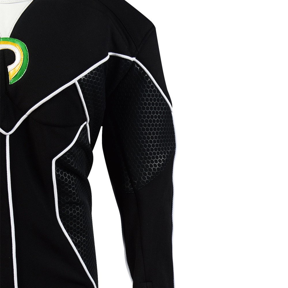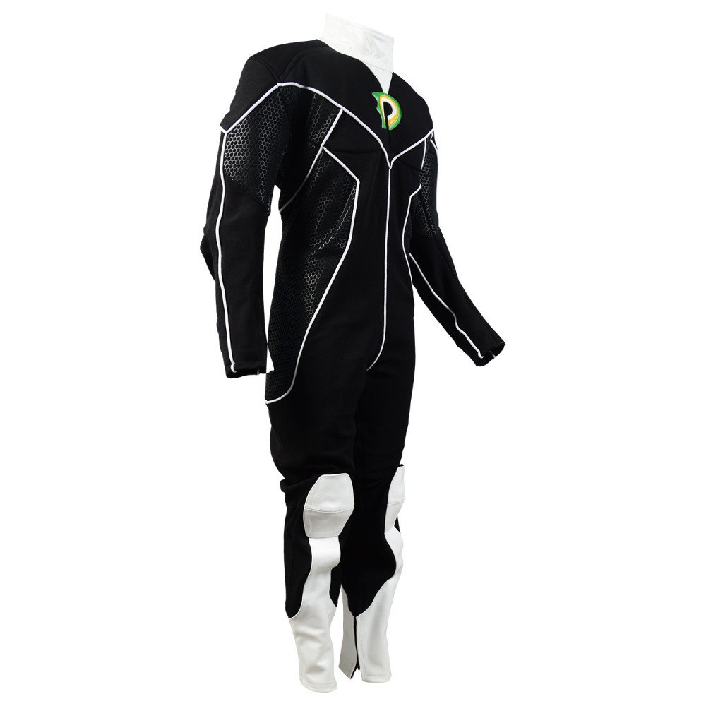 - Suit Material : Textured four-way stretch fabric with black printed panels in sides ( white Leather parts )