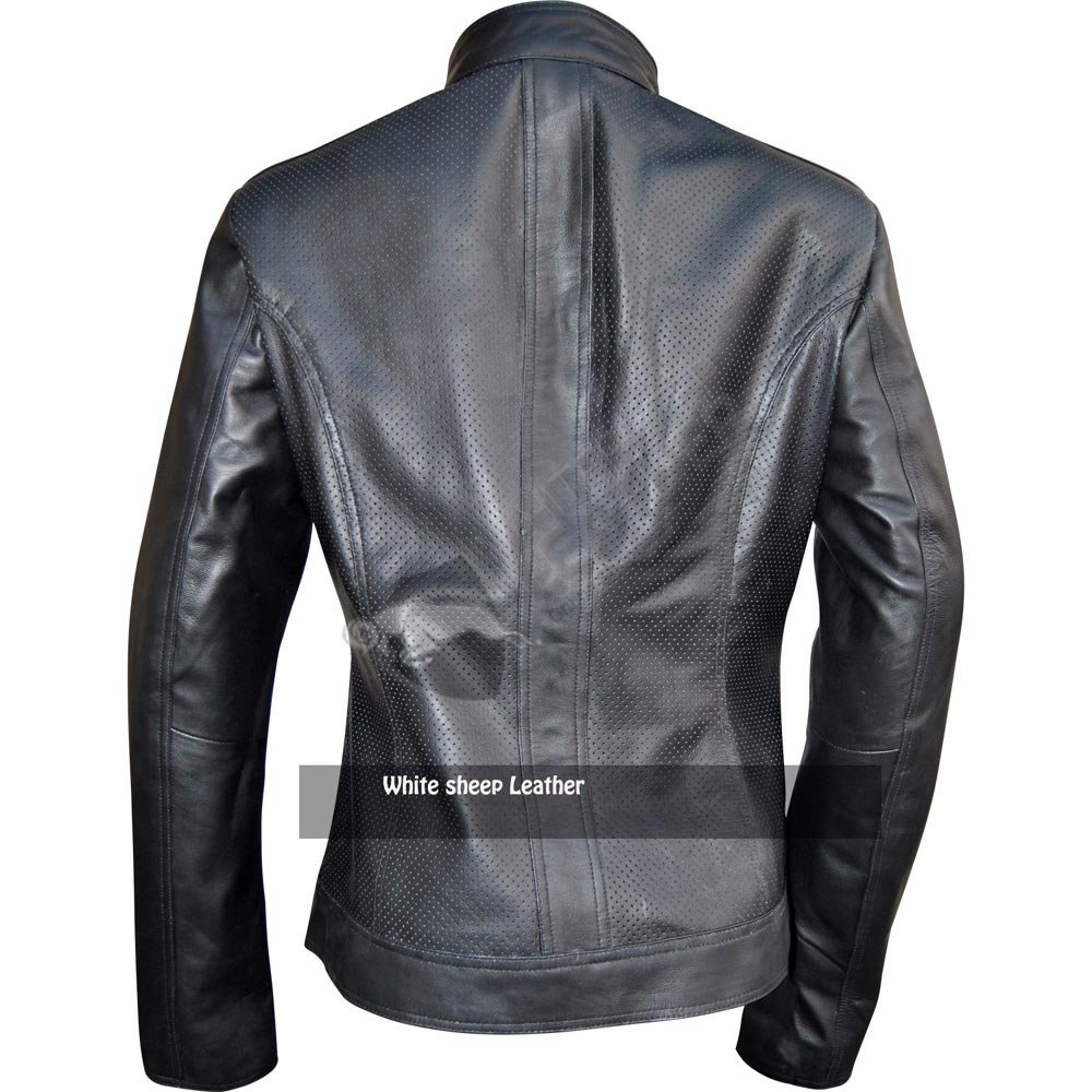 The Women’s black perforated style leather jacket has been manufactured with 100% genuine sheepskin leather material. The jacket has been the creation of hard work by our experts who designed and produced special details along with R4 size perforation that add more value to the design of the jacket. It has been equipped with real high quality YKK zipper closure on front side. In addition, the jacket also has been decorated with two attractive zipped pockets on waist sides of front and two have been provided on front chest sides. It has silver buttons and gun metal YKK zippers that enhance the beauty of the black color of the jacket.