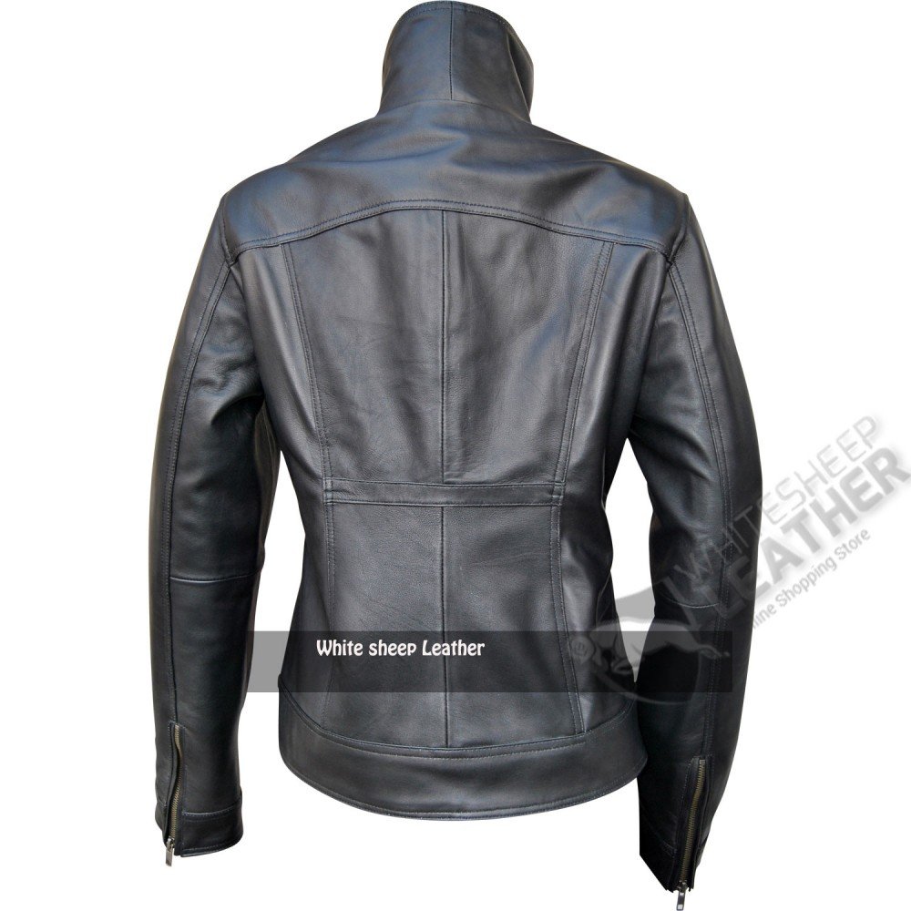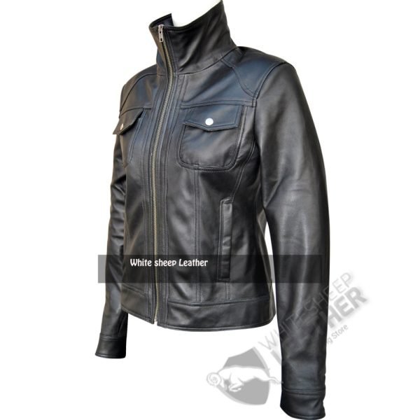 The Women’s four pockets styled leather jacket has been made with 100% real sheepskin leather material that has the properties of durability and comfort together. The jacket has been equipped with original YKK zippers on front to give you more ease of fastening. It also has zipped cuffs that are in gunmetal color. The jacket attracts and caters especially those women who like to have a style with zip up bane collar. The jacket has silver buttons to add value to its charm. The overall design and stitching has been taken care of by our experts to maintain its details and stylish appearance.